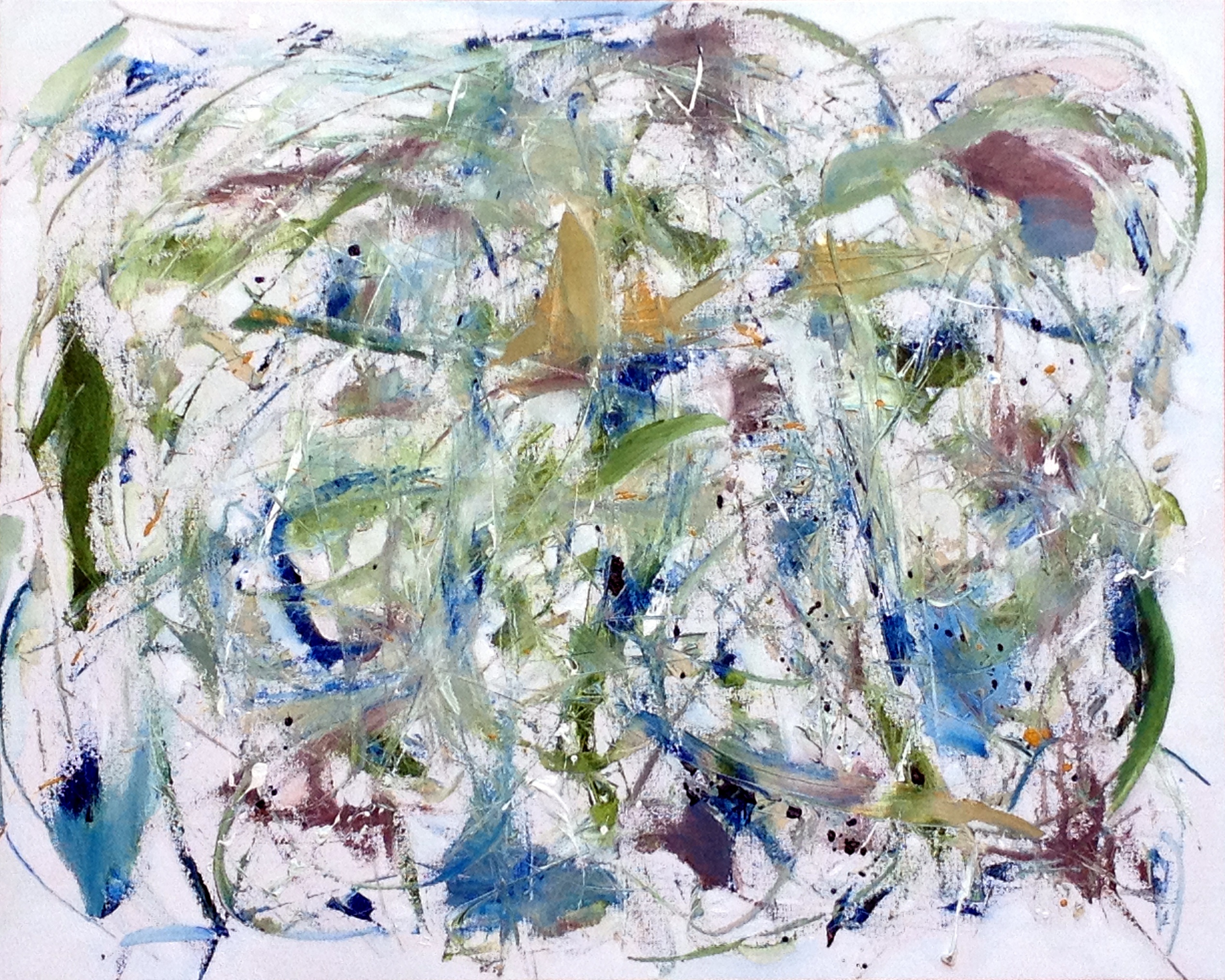 This piece is a prime example of the unpredictability in spontaneous painting. My usual process in a “geode” painting is to mix the paint directly on the canvas and eventually begin blending the colors to produce the band-like effects. With this piece, however, once I finished the initial mixing stage, I realized this is what the painting wanted to be – it didn’t want me to go any further. Even thought I’d just begun, I listened to the painting and stepped away. This piece reminded me that sometimes, the most important actions are the ones you don’t take.